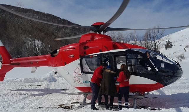 Tokat'ın Almus ilçesinde yaşayan 65 yaşındaki kadın hasta, yoğun kar yağışı nedeniyle kara yolu ulaşılamayınca helikopter ambulansla hastaneye sevk edildi.