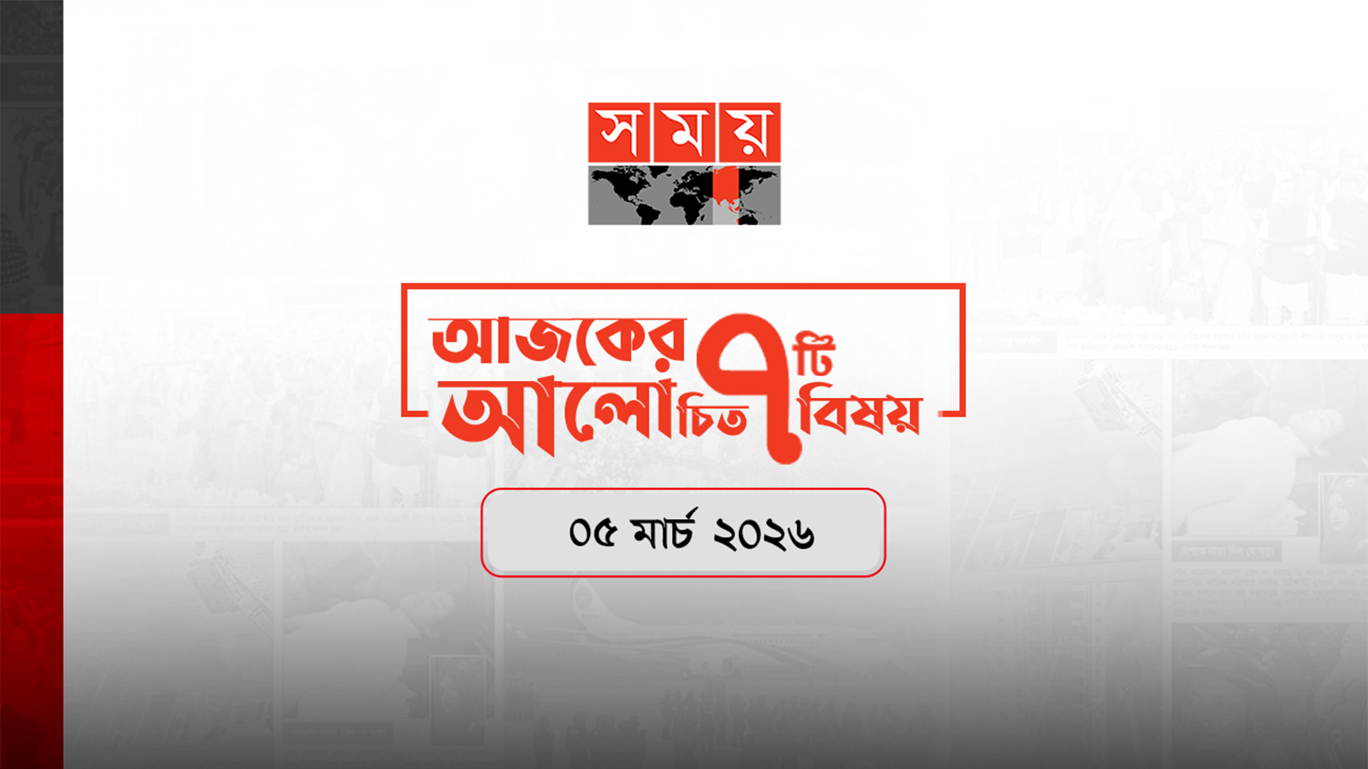 দেশের শীর্ষ জনপ্রিয় টেলিভিশন চ্যানেল সময় টিভি। টেলিভিশনটির অনলাইন সংস্করণ ‘সময় নিউজে’ বৃহস্পতিবার (৫ মার্চ) প্রকাশিত সেরা সাতটি আলোচিত খবর পাঠকদের জন্য তুলে ধরা হলো।ঈদের ছুটি বাড়ল পবিত্র ঈদুল ফিতরে ঘরমুখী মানুষের যাত্রা নির্বিঘ্ন করতে ছুটি আরও একদিন বাড়িয়েছে সরকার। আগামী ১৮ মার্চ নির্বাহী আদেশে সাধারণ ছুটি থাকবে। বিস্তারিত পড়তে এখানে ক্লিক করুন। বেগম খালেদা জিয়াসহ ১৫ ব্যক্তি ও ৫ প্রতিষ্ঠান পাচ্ছে স্বাধীনতা পুরস্কার জাতীয় পর্যায়ে গৌরবোজ্জ্বল ও কৃতিত্বপূর্ণ অবদানের স্বীকৃতিস্বরূপ ‘স্বাধীনতা পুরস্কার ২০২৬’ প্রদানের সিদ্ধান্ত গ্রহণ করেছে সরকার। সাবেক প্রধানমন্ত্রী বেগম খালেদা জিয়া ১৫ জন বিশিষ্ট ব্যক্তি এবং ৫টি প্রতিষ্ঠানকে এ বছর সর্বোচ্চ এই রাষ্ট্রীয় সম্মাননার জন্য মনোনীত করা হয়েছে। বিস্তারিত পড়তে এখানে ক্লিক করুন। দ্বিতীয় পর্যায়ের যুদ্ধে ইরানের ভূগর্ভস্থ ক্ষেপণাস্ত্র স্থাপনায় হামলা চালাবে ইসরাইল, সূত্রের খবর ইরানে ইসরাইলের যুদ্ধ দ্বিতীয় পর্যায়ে প্রবেশ করার সাথে সাথে তাদের যুদ্ধবিমানগুলো মাটির গভীরে চাপা পড়ে থাকা ব্যালিস্টিক ক্ষেপণাস্ত্র স্থাপনাগুলোতে আক্রমণ করবে, ইসরাইলের সামরিক অভিযানের সাথে পরিচিত দুটি সূত্র জানিয়েছে। বিস্তারিত পড়তে এখানে ক্লিক করুন। ইলেকশন ইঞ্জিনিয়ারিংয়ের অভিযোগ: রিজওয়ানা হাসানের বিরুদ্ধে তদন্ত দাবি জামায়াত সেক্রেটারির ইলেকশন ইঞ্জিনিয়ারিংয়ের দায়ে সাবেক উপদেষ্টা রিজওয়ানা হাসানকে জিজ্ঞাসাবাদ ও এই ঘটনার বিচার বিভাগীয় তদন্তের দাবি জানিয়েছেন বাংলাদেশ জামায়াতে ইসলামীর সাধারণ সম্পাদক মিয়া গোলাম পরওয়ার। বিস্তারিত পড়তে এখানে ক্লিক করুন। ইরান যুদ্ধ: কোন দেশে প্রাণহানি কত? ইরানের বিরুদ্ধে যুক্তরাষ্ট্র ও ইসরাইলের চলমান সংঘাত ষষ্ঠ দিনে গড়িয়েছে। এরইমধ্যে এই সংঘাত মধ্যপ্রাচ্যে ছড়িয়ে পড়েছে। ফলে প্রায় সব দেশেই হতাহতের সংখ্যা বাড়ছে। বিস্তারিত পড়তে এখানে ক্লিক করুন। ভারতকে হারিয়ে ফাইনাল নিশ্চিতে ইতিহাস গড়তে হবে ইংল্যান্ডকে ইংল্যান্ডের বোলারদের তুলোধুনো করে ফাইনাল নিশ্চিতের মিশনে ভারতকে বড় পুঁজি এনে দিলেন স্যাঞ্জু স্যামসন-ইশান কিশানরা। জিততে হলে টি-টোয়েন্টি বিশ্বকাপে নতুন ইতিহাস গড়তে হবে হ্যারি ব্রুকদের। বিস্তারিত পড়তে এখানে ক্লিক করুন। ঢালিপাড়ায় গুঞ্জন: যুক্তরাষ্ট্রে গেলেন সন্তানসম্ভবা বুবলি, শাকিব খান কি আবারও বাবা হচ্ছেন? দেশে নেই ঢাকাই সিনেমার জনপ্রিয় চিত্রনায়িকা শবনম বুবলী। শোনা যাচ্ছে, দ্বিতীয় সন্তানসম্ভবা অভিনেত্রী যুক্তরাষ্ট্রে পাড়ি জমিয়েছেন। শোবিজ জগতে গুঞ্জন– কন্যাসন্তানের মা হচ্ছেন বুবলি আর বাবা হচ্ছেন মেগা