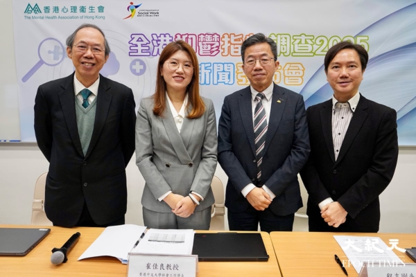 香港心理卫生会执行委员会委员黎守信医生、中大社会工作学系崔佳良教授、心理卫生会总干事程志刚及副总干事黄敏信公布“全港抑郁指数调查”结果。(余钢/大纪元)