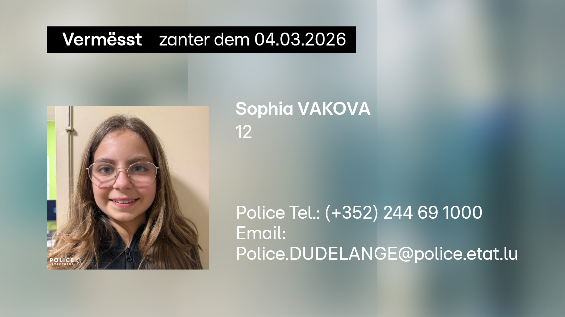 Police: Dat 12 Joer aalt Sophia Vakova gëtt zënter dem Mëttwoch vermësst