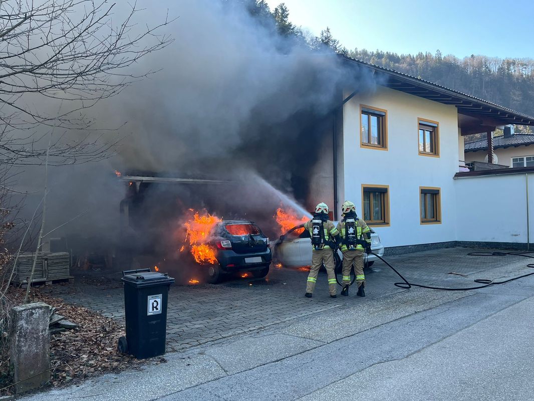 Ein technischer Defekt an einem Fahrzeug dürfte am Donnerstagvormittag einen Garagenbrand in Schwoich ausgelöst haben. Das Feuer beschädigte zwei Pkw, ein Moped und die Garage schwer. Verletzt wurde bei dem Brand niemand.