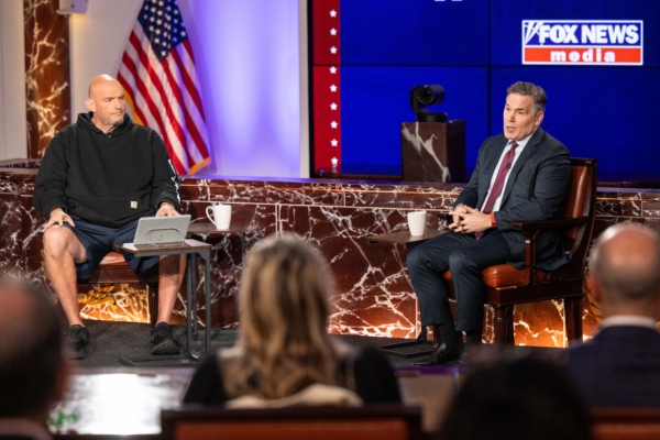 2025年6月2日,宾州的联邦参议员约翰·费特曼(John Fetterman, 左)和戴维· 麦考密克(Dave McCormick, 右)在波士顿美国参议院爱德 华· 肯尼迪研究所举行的参议院项目第六期会议上发表讲话,该会议由福 克斯新闻主播香农· 布里姆主持。(Scott Eisen/Getty Images)