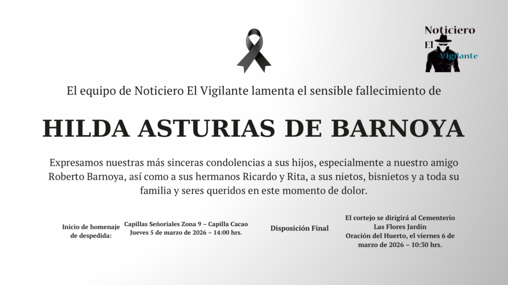 Familiares y amigos lamentan el fallecimiento de Hilda Asturias de Barnoya. Su homenaje de despedida se realiza en Capillas Señoriales, zona 9, en la Capilla Cacao, iniciando el jueves 5 de marzo de 2026 a las 14:00 horas. La despedida final será el viernes 6 de marzo a las 10:30 horas. Sus restos descansarán en […] The post Descanse en Paz Hilda Asturias de Barnoya appeared first on vigilante .
