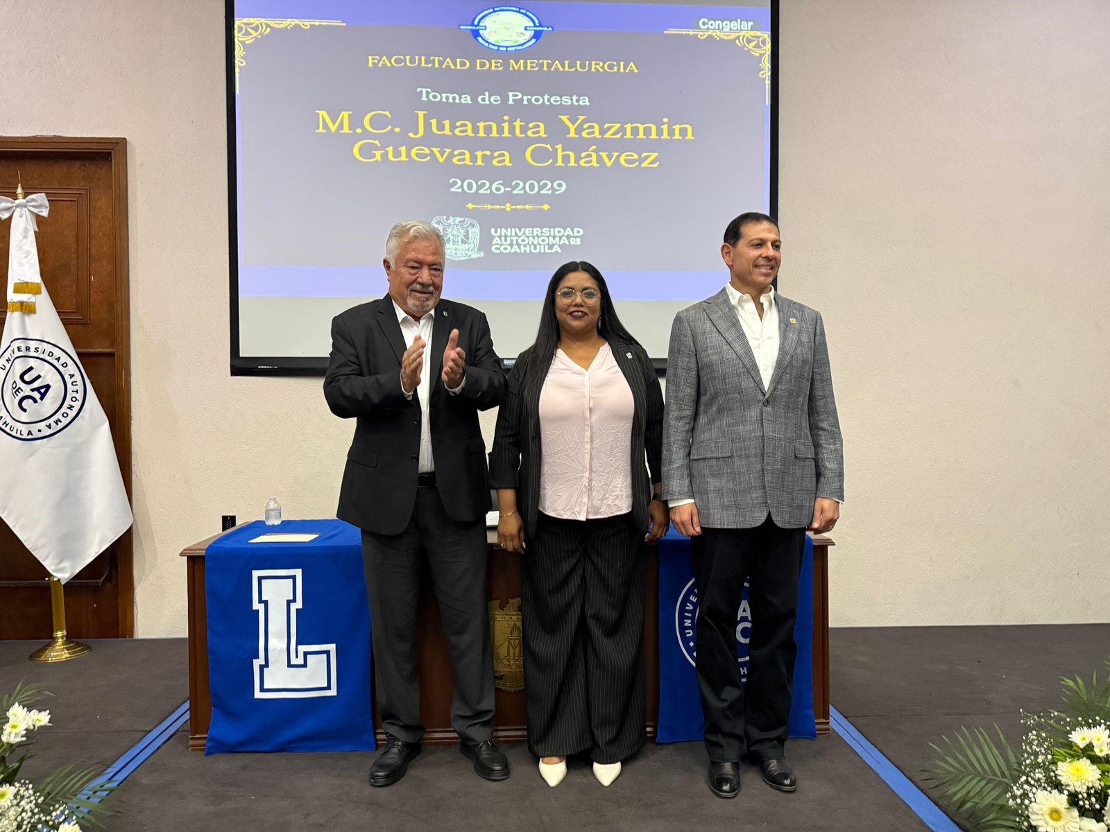 MONCLOVA, COAH.- Durante una gira de trabajo por esta ciudad, el rector de la Universidad Autónoma de Coahuila, Octavio Pimentel Martínez, tomó protesta a la maestra Juanita Yazmín Guevara Chávez como directora de la Facultad de Metalurgia, así como a Édgar Julián Hernández Cardona como presidente de la Academia de Directores de la Unidad Norte.