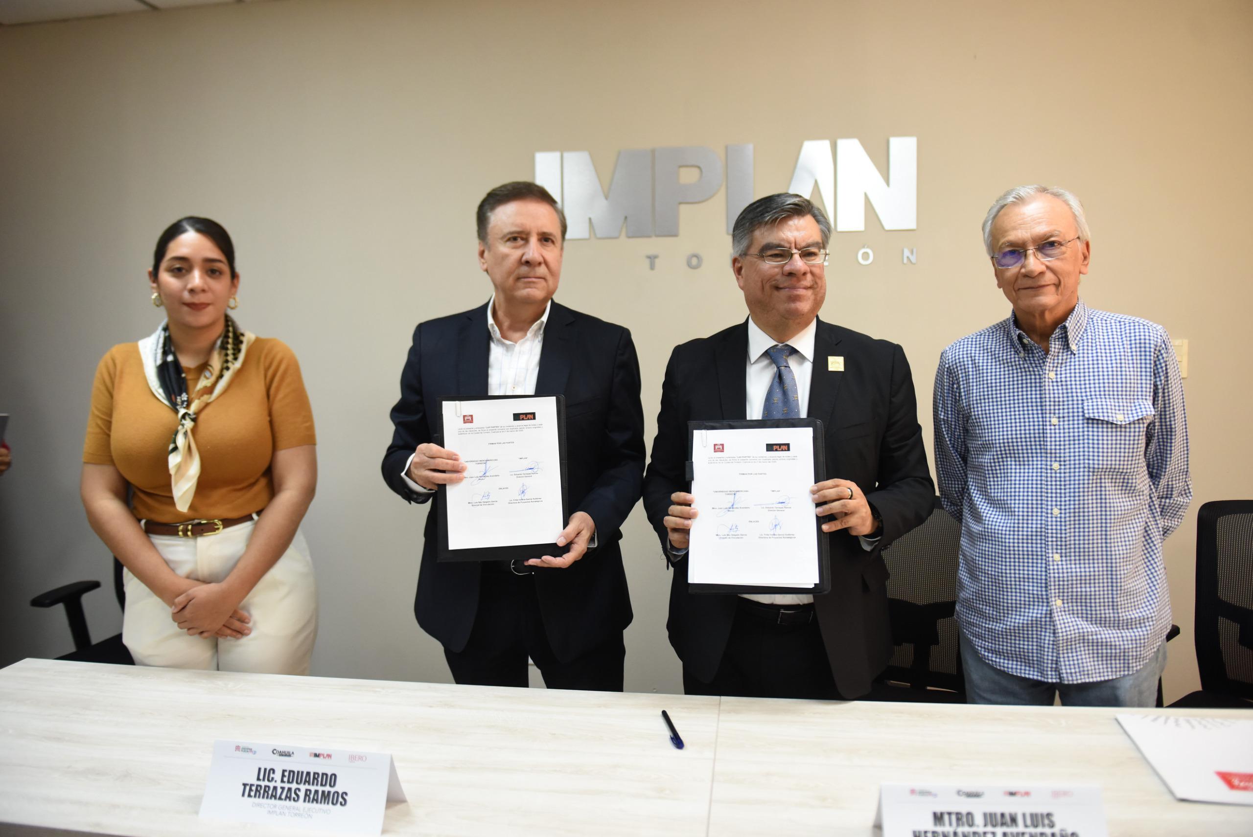 Con el propósito de fortalecer la generación de conocimiento aplicado y contribuir al desarrollo estratégico de la ciudad, el Instituto Municipal de Planeación y Competitividad de Torreón (IMPLAN ) y la Universidad Iberoamericana firmaron este jueves un convenio de colaboración que permitirá impulsar proyectos conjuntos en beneficio del municipio y de la formación académica de los estudiantes.