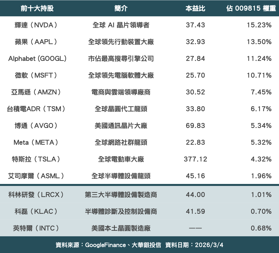Newtalk新聞 以美國科技巨頭(MEGA 7)為持股核心的大華美國MAG7+(009815)公告最新成分股更換名單,並於昨(5)日盤後生效。本次各新增、剔除 3 檔成分股,分別納入半導體大廠英特爾(Intel)、半導體設備製造商科磊(KLA)與科林研發(Lam Research);剔除 ServiceNow、ADOBE 以及索尼(SONY)。 觀察此次換股名單,此次布局更加貼近於 AI 硬體,尤其半導體產業,這些個股近幾年來股價均動輒翻倍,但對比輝達、谷歌、微軟等科技巨頭,漲幅仍落後一些。 大華美國MAG7+經理人薛竣友表示,當前科技股的投資主軸仍為 AI 技術發展,其中半導體更是 AI 發展的核心。儘管近期美股受關稅政策與美國伊朗戰爭影響相對震盪,不過在美國經濟仍相當穩固下,短期的下跌,將成為中長期投資者入手美股的好時機。 過去投資人對於科技股的印象都是本益比相對較高,但薛竣友指出,據《彭博》統計,「彭博 MAG7 指數」至二月底的預估本益比為 23.8 倍,低於 S&P500 核心消費類股指數的 24.2 倍,與 Nasdaq 100 指數的 25.5 倍。再從近五年股價、營收表現之年複合成長率(CAGR)來看,仍具有吸引力。由於這些美國科技龍頭的競爭優勢還在且難以動搖,在 AI 發展加速且競爭越加激烈之際,當前科技巨頭仍極具投資吸引力。 ▲009815 最新前十大持股&新增成分股之本益比 薛竣友表示,前陣子七巨頭與科技龍頭企業的財報公布後,股價因市場重新調整未來增長預期而下跌。然而,這些科技龍頭的技術優勢與護城河仍存在,長期發展趨勢不變。近期,科技股也開始浮現利多,如博通(AVGO)周三(4 日)盤後公布財報,營收年增 29%、其中 AI 營收年增 106%,且第二季財測亦超出市場預期,顯示 AI 需求依舊相當火熱。 輝達 GTC 大會將於三月中旬登場,執行長黃仁勳已預告將要發表「前所未見的晶片」。市場預期,輝達可能於 GTC 中公開下一代 AI 晶片架構「Feyman」,且傳出將導入台積電 1.6nm 製程技術,有望再次點燃市場對 AI 類股的上漲情緒。 ※Newtalk提醒您: #投資一定有風險,投資有賺有賠,投資前應檢視自身能力,申購前應詳閱公開說明書。 延伸閱讀: 台股開盤》台積乏力 大盤跌270點 分析師:回測觀察33,378支撐 果粉搶翻!iPhone 17e預約首日暴增3成 嫩粉色意外成最夯 專家看盤》台股返月線 跌深反彈 分析師:短線止跌但不宜追高 亞馬遜AI大升級 The Canvas讓賣家決策秒完成 光通訊時代台供應鏈迎大行情!華星光、聯亞...冠軍操盤手:AI投資買新不買舊「6檔口袋名單出列」