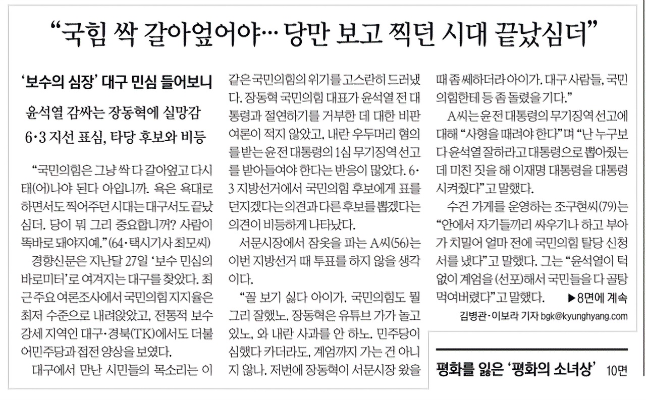 대구와 관련해 두 개의 기사가 났습니다. 제목만 보겠습니다. 3월 1일 자 <한겨레> 성한용 기자의 '정치 막전막후' 제목은 '국힘, TK 빼고 전패 어게인?'입니다. 하루가 지나고 봤더니, 네이버 댓글이 1200개가 넘었습니다. 역대급으로 댓글이 많이 달렸습니다. 다음날인 3월 2일 자 <경향신문> 대구 르포 기사의 제목은 "'대구서도 끝났심더' '꼴 보기 싫다 아이가'...국힘에 싸늘해진 보수 민심 바로미터"입니다. 성한용 기자의 칼럼은 민주당이 대구·경북에서는 못 이긴다고 봅니다. 반면 경향은 대구도 국민의힘에 등 돌리고 있다고 합니다. '밖에서 대구 보기'의 위험성 갑자기 대구 민심에 관심이 쏠린 이유가 있을 겁니다. 최근 여론조사 결과 때문인 듯합니다. 지난 2월 26일, 이재명 대통령의 지지율이 역대 최고인 67%를 기록했으며 대구 경북조차 정당 지지율이 28% 동률이었다는 조사 결과가 나왔습니다. NBS의 조사입니다. 그에 더해 보수의 아성인 대구 경북에서 정작 국민의힘이 자해적 갈지자 행보를 하는 중입니다. 대구·경북 행정 통합 문제 때문입니다. 시도민이 부글부글합니다. 저는 대구에서 중고등학교를 다녔습니다. 김부겸 의원의 보좌관으로 오래 일했습니다. 2012년, 2016년 수성구에서 선거를 치렀습니다. 2014년 시장 선거와 2020년 총선은 간접적으로 도왔습니다. 모두 네 번의 선거를 치른 덕에 저는 대구의 정치 민심을 조금 안다면 압니다. 이번 지방선거에서 대구 표심은 어떨까요? 민주당 후보가 이길 수도 있을까요? 결론부터 말씀드리면, 이긴다고 생각하고 덤비면 안 된다는 게 제 생각입니다. 그렇다고 지레 포기해서도 안 됩니다. 그것보다 대구를 바라보는 관점의 문제를 말씀드리고 싶습니다. 특히 대구 밖에서 보는 관점입니다. 대구에서 민주당 간판으로 이겨본 건 김부겸 후보가 거의 유일합니다. 참패도 당했습니다. 수도권에서는 같은 선거구에서 4선, 5선 하는 경우도 흔합니다. 표밭이 좋고, 후보가 지역구 관리를 열심히 하면 그렇게 됩니다. 대구는 어떨까요? 표밭은 민주당에 불리합니다. 대개 25% 정도 얻습니다. 김부겸 의원도 지역구 관리에 게으른 타입은 아닙니다. 그런데 수성구에서의 김부겸 득표는 극적으로 늘었다 줄었다 합니다. 간단한 표를 정리해 왔습니다. 김부겸 후보는 2016년에 유일하게 이겼습니다. 첫 출마였던 2012년부터 2년마다 득표율이 10%P씩 올라간 게 보입니다. 2014년 대구 시장 선거에선 전체로는 졌지만, 수성(갑)에서는 권영진을 이겼습니다. 2016년에는 김문수를 무려 20% 이상 이깁니다. 그런데 불과 4년 뒤인 2020년 선거에선 완패합니다. 수성(을)에서 옮겨 온 주호영 후보가 이미 4선이었으니 강적이긴 합니다. 하지만 20%P이겼다가 거꾸로 20%P 졌습니다. 도대체 무슨 일이 벌어졌을까요? 무서운 보수의 역결집 두 가지 변화가 있었습니다. 첫째, 보수 정당이 여당이었다가 야당으로 전락했습니다. 2017년 박근혜 대통령이 탄핵, 파됐었습니다. 문재인 정부가 들어섰습니다. 당시만 해도 의석이 105:110으로 팽팽했습니다. 그러나 선거일이 다가오면서 패색이 짙다는 뉴스가 연일 보도됐습니다. 결과는 84:163 대패였습니다. 그러니 탄핵당한 데 대한 패배감과 총선에서 또 질 것 같다는 위기감이 대구 민심 기저에 팽팽히 감돌고 있었을 터입니다. 둘째, 후보 개인 문제입니다. 김부겸 후보는 2017년부터 2년간 행정안전부 장관직을 수행했습니다. 그래도 지역을 열심히 챙겼습니다. 솔직히 고백 드리건대, 지역구 챙기는 데 행안부만큼 좋은 부처가 있겠습니까? 그러나 기대와 달랐습니다. '기껏 뽑아 줬더니 코빼기도 안 비친다'라는 볼멘소리가 들려왔습니다. 심지어 배신감을 토로하는 이들도 있었습니다. 전체 내용보기