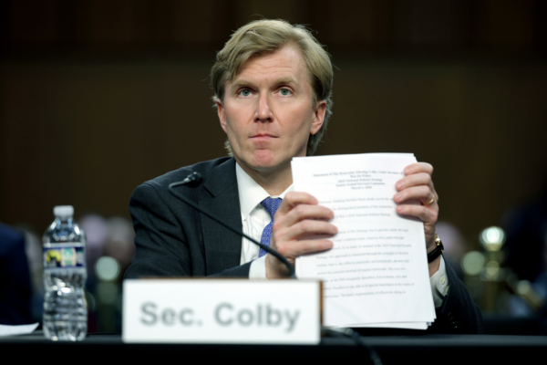 图为美国战争部政策副部长科尔比,于3月3日出席参议院军事委员会的听证会。(Kevin Dietsch/Getty Images)