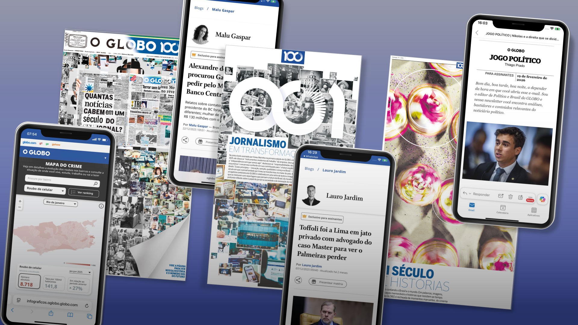 Além da cobertura do caso Master, escolhida em primeiro lugar, a lista de melhores trabalhos do GLOBO em 2025 combinou reportagens investigativas, entrevistas inéditas e olhar apurado sobre questões urgentes do país e do mundo. A premiação, com os votos de editores da Redação Integrada, traz ainda uma menção honrosa à edição impressa especial de centenário. Publicada em 27 de julho, ela se tornou a maior da história do jornal, com 524 páginas. Esta edição histórica contou com 14 cadernos temáticos, reunindo reportagens especiais sobre a trajetória do GLOBO e com reflexões sobre o futuro do jornalismo e do mundo. Primeira página especial e Caderno especial dos 100 anos Arte O GLOBO Entre os melhores trabalhos de 2025, a segunda colocação ficou com o Mapa do Crime, lançado em julho com trabalho conjunto das editorias Rio e de Arte. A ferramenta, que também ganhou o prêmio anual de inovação, compilou pela primeira vez as estatísticas de delitos por bairro, e pode ser acessada no site do GLOBO, em celulares e tablets. O mapeamento reuniu mais de 250 mil registros de ocorrência obtidos via Lei de Acesso à Informação, depois checados pelas equipes envolvidas e organizados com auxílio de inteligência artificial, para corrigir erros de digitação e incorreções. A partir do Mapa do Crime, O GLOBO já fez mais de cem matérias sobre roubos de celular, a transeuntes e outros delitos que afetam diariamente a população da capital fluminense. Em dezembro, o mapa passou a exibir também dados de roubos nos bairros de Niterói. Mapa do Crime Arte O GLOBO Em terceiro lugar, e completando o pódio de melhores trabalhos do ano, está a entrevista conduzida pela editora de Saúde, Adriana Dias Lopes, com a médica Roberta Saretta, que acompanhou a doença da cantora Preta Gil do início ao fim. Na entrevista, a médica contou como foram os últimos momentos de Preta Gil, que faleceu em julho, destacando o carisma e a sensibilidade da cantora mesmo em momentos delicados do tratamento. Saretta também explicou a progressão da doença— um câncer com mutações raras — que vitimou a cantora, o que realçou a importância de exames médicos periódicos e de debates sobre possíveis tratamentos à doença. No jornal Extra, o prêmio de melhor trabalho do ano ficou com a série “Bonde dos Fantasmas”, assinada pela repórter Roberta de Souza. A série revelou com exclusividade a atuação de policiais militares que assaltavam pontos de venda de drogas. O prêmio de integração entre os jornais foi conferido aos conteúdos especiais do GLOBO e Extra envolvendo a pré-estreia do filme “Vitória”. Inspirado em reportagens do hoje editor-executivo Fábio Gusmão, o filme foi recebido, no GLOBO, com um texto de Gusmão, em primeira pessoa, sobre bastidores da história. Já o Extra apresentou detalhes inéditos da trajetória de Joana da Paz, a “Dona Vitória”, que filmou a atuação do tráfico na Ladeira dos Tabajaras em uma luta (quase) silenciosa contra o crime. No mesmo Tabajaras, duas décadas depois, a fotógrafa Márcia Foletto registrou em 2025 o gesto de uma mulher que cobriu os olhos de uma criança, para evitar que ela testemunhasse, diante de si, a passagem de um cadáver escoltado por policiais armados. O contraste entre a inocência infantil e a brutalidade da guerra contra o tráfico no Rio, captado pelas lentes da fotógrafa, foi reconhecido com o prêmio de imagem do ano no GLOBO. Prêmio de melhor imagem: adolescente cobre rosto de criança com a mão, durante retirada de cadáver em operação na Ladeira dos Tabajaras Márcia Foletto / Agência O Globo / 15-04-2025 Já entre as novidades do GLOBO em 2025, a newsletter Jogo Político, do editor Thiago Prado, ganhou o prêmio de melhor novo produto para o leitor. Enviada semanalmente por email, a newsletter faz parte da estratégia do jornal para diversificar as formas de distribuição de conteúdo. Além dos boletins semanais, a Jogo Político transformou uma série de entrevistas com maqueteiros no e-book “Quem será o próximo presidente?”, e também promoveu entrevistas em vídeo com os estrategistas eleitorais. Jogo Político, novo produto para o leitor Arte O GLOBO A premiação em cada categoria PRÊMIO PRINCIPAL 1º lugar Caso Master: Os colunistas Lauro Jardim e Malu Gaspar trouxeram furos de reportagem sobre a proximidade do banqueiro Daniel Vorcaro com autoridades dos três Poderes, em uma cobertura que segue tendo desdobramentos em 2026. 2º lugar Mapa do Crime: A ferramenta, lançada pelas editorias Rio e de Arte, compilou mais de 250 mil registros de ocorrências na capital fluminense e apresentou os dados por bairro. O mapeamento deu origem a mais de uma centena de reportagens sobre os diferentes tipos de delitos na cidade. 3º lugar Entrevista com Roberta Saretta, a médica de Preta Gil: Conduzida pela editora de Saúde, Adriana Dias Lopes, a entrevista trouxe detalhes dos últimos momentos da cantora, que faleceu em julho. A matéria levantou debates sobre a importância de exames periódicos e avanços em tratamentos de saúde, além de registrar o carisma de Preta mesmo em momentos delicados. IMPACTO DIGITAL Caso Master: Os principais furos de reportagem publicados nos blogs de Lauro Jardim e de Malu Gaspar no site do GLOBO geraram alto volume de audiência e de venda de assinaturas ao longo do ano. INOVAÇÃO Mapa do Crime: Disponível no site do GLOBO e com formato acessível também em celulares e sites, a ferramenta teve mais de 1 milhão de acessos já nas duas primeiras semanas de lançamento, e se consolidou como ponto de partida para várias outras reportagens. INTEGRAÇÃO ENTRE JORNAIS Cobertura do filme “Vitória”: A pré-estreia do filme, inspirado em reportagens do hoje editor-executivo Fábio Gusmão, foi recebida com um texto em primeira pessoa de Gusmão no GLOBO, sobre bastidores da história; e com uma matéria, no Extra, focada em pontos inédito
