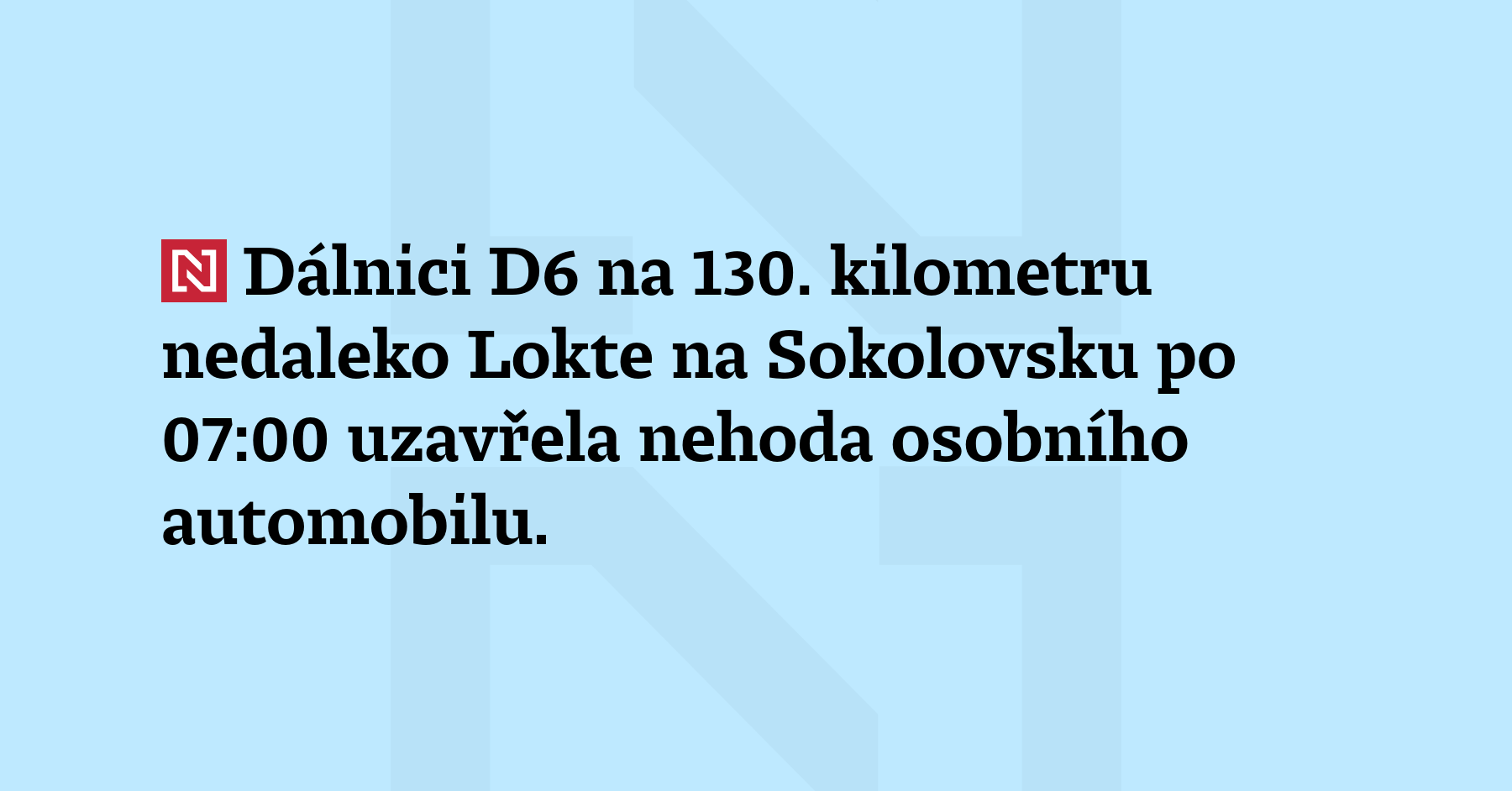Dálnici D6 na 130. kilometru nedaleko Lokte na Sokolovsku po 07:00 uzavřela nehoda osobního automobilu. Vůz se po kolizi převrátil a blokuje provoz na Cheb, vyplývá z informací Národního dopravního informačního centra. Na místě zasahují záchranáři. Nehoda se stala mezi výjezdy na Těšovice a Nové Sedlo. Podle odhadů silničářů by mohla být dálnice uzavřená zhruba dvě hodiny. (ČTK)