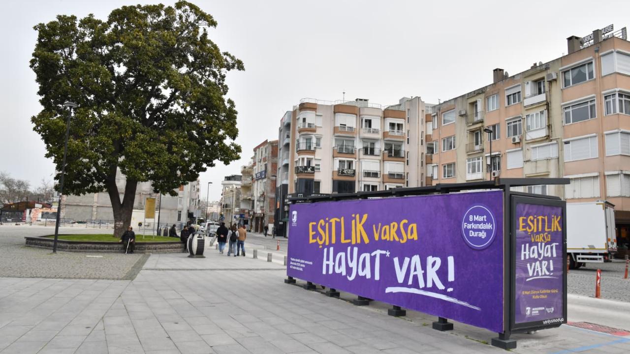Çanakkale Belediyesi tarafından, 8 Mart Dünya Kadınlar Günü kapsamında kadına yönelik şiddetle mücadeleye dikkat çekmek amacıyla İskele Meydanı'nda yer alan otobüs durağı “8 Mart Farkındalık Durağı” olarak düzenlendi.