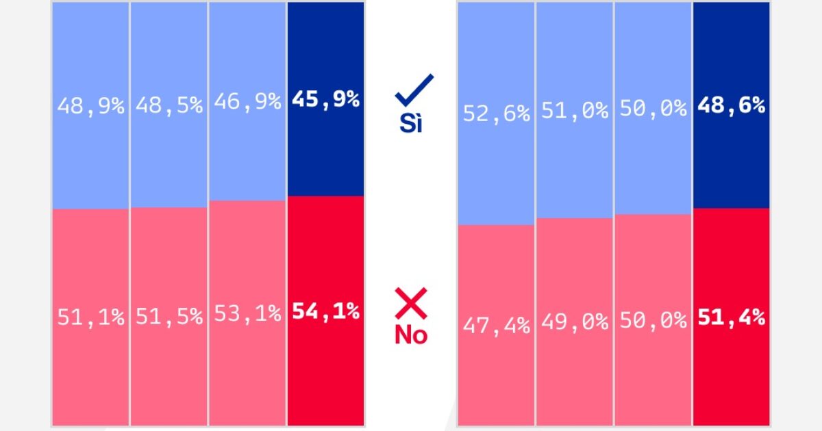 Il No davanti al Sì a prescindere dall’affluenza. L’ultimo sondaggio di YouTrend sul referendum del 22 e 23 marzo fotografa un sorpasso consolidato dei contrari alla riforma Nordio, che ormai prevalgono su favorevoli in tutte le ipotesi di partecipazione al voto. L’ultima rilevazione dell’istituto per SkyTg24, pubblicata venerdì 6 marzo, considera come al solito due […] L'articolo Referendum, l’ultimo sondaggio Youtrend: il No davanti al Sì anche in caso di affluenza alta proviene da Il Fatto Quotidiano .