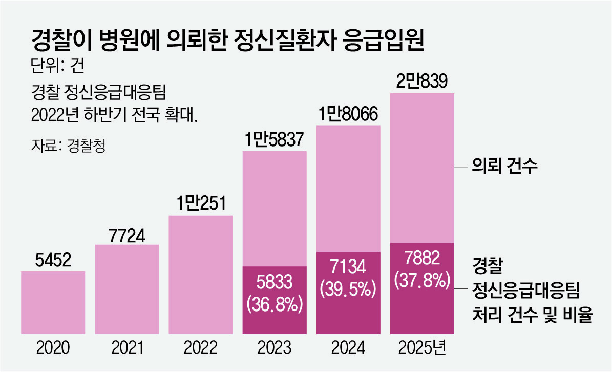 지난해 9월 9일 강원 춘천시 춘성대교에서 수면제를 다량 복용하고 투신하려던 50대 남성이 경찰에 구조됐다. 우울 증세가 심각해 다시 투신을 시도할 우려가 컸기에 즉각 정신병원에 입원해야 하는 상태였다. 하지만 경찰관 2명이 달라붙어 강원과 경기 지역 병원 28곳에 전화를 돌리는 사이 시간만 흘러갔다. 음독 치료와 정신과 진료가 동시에 가능한 병상을 찾지 못했기 때문이다. 결국 이 환자는 구조된 지 32시간이 지나서야 인천의 한 병원에 입원할 수 있었다.● 정신질환 응급입원, 5년 새 3.8배로이처럼 자신이나 다른 사람에게 해를 끼칠 우려가 있는 정신질환자를 긴급히 입원시켜 달라고 경찰이 병원에 의뢰하는 ‘응급입원’ 사례가 지난해 처음으로 2만 건이 넘었지만 환자를 받아줄 병상이 부족한 것으로 나타났다. 6일 경찰청에 따르면 정신질환 응급입원 의뢰는 2020년 5452건에서 지난해 2만839건으로 5년 새 3.8배로 증가했다. 이는 정신질환자 강제 입원 결정을 보호자에게 맡기는