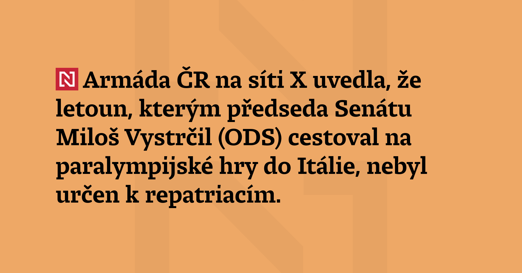 Armáda ČR na síti X uvedla, že letoun, kterým předseda Senátu Miloš Vystrčil (ODS) cestoval na paralympijské hry do Itálie, nebylo určeno k repatriacím. „Evakuace Čechů z Blízkého východu nebyly a nemohly být dotčeny,“ zdůraznila. Armáda ČR reagovala na výhrady vládních politiků, kteří kritizovali Vystrčila za to, že odletěl armádním speciálem v době, kdy tisíce Čechů uvázly v zemích Blízkého […]