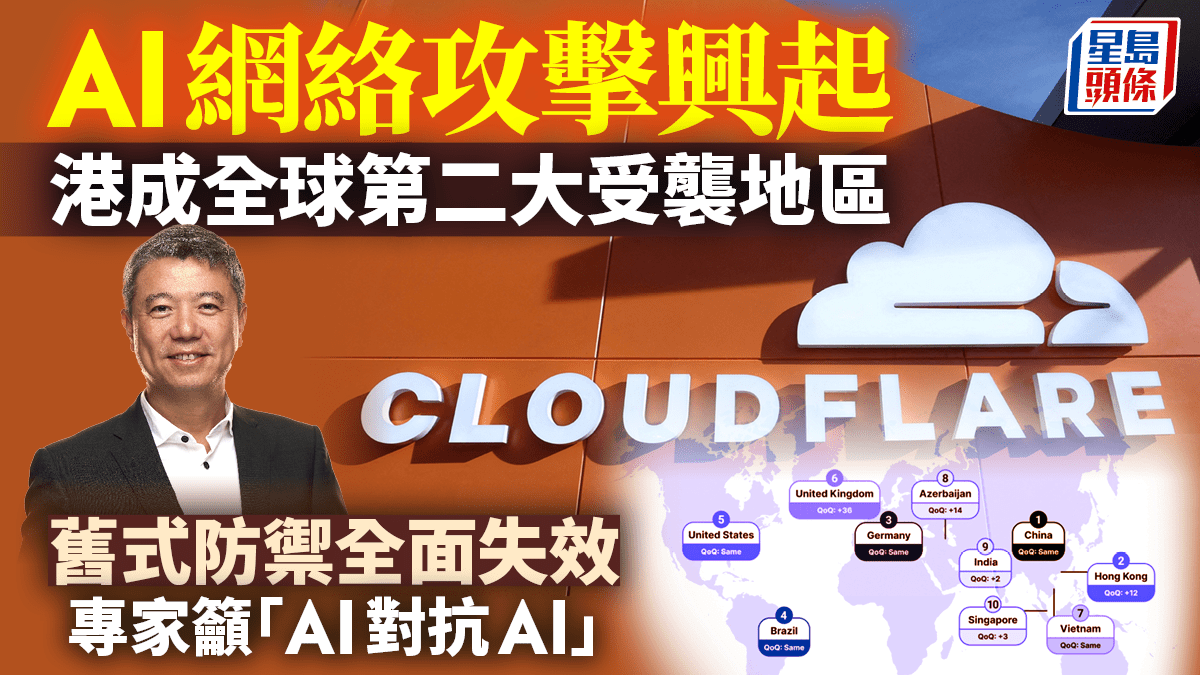 Cloudflare最新DDoS威脅報告顯示,2025年第四季度香港遭受DDoS攻擊的排名較上一季度躍升12位,首次成為全球第二大受攻擊地區。這一驚人數字背後,是人工智能(AI)正從「輔助工具」進化為「自主攻擊器」,黑客不再坐在電腦前敲代碼,而是釋放出具備自主決策能力的「AI智能體」(AI Agent),全天候自動獵殺目標。Cloudflare大中華區副總裁暨中國區總經理蔡旭輝(Xavier)接受