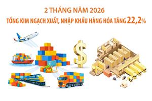 2 tháng năm 2026, tổng kim ngạch xuất, nhập khẩu hàng hóa đạt 155,7 tỷ USD, tăng 22,2% so với cùng kỳ năm trước, trong đó xuất khẩu tăng 18,3%; nhập khẩu tăng 26,3%. Cán cân thương mại hàng hóa nhập siêu 2,98 tỷ USD.