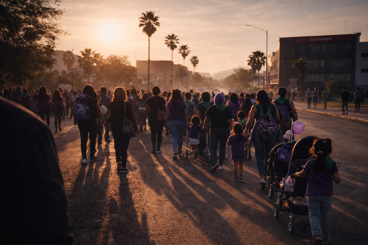 Es 2025. 8 de marzo. Llegamos al bloque de infancias sin dificultad. Estamos en el periférico Luis Echeverría con cruce en el V. Carranza y a un lado del puente los pañuelos verdes y morados cubren rostros y reciben a las asistentes. Desde afuera se ve una logística mejorada con los años. Carriolas, pañaleras, sombrillas, botellas de agua. No es un paseo. Es una marcha con niñas y niños al centro, como si el gesto de proteger a las infancias fuera también una forma de decirle a la ciudad lo que se le tiene que decir.