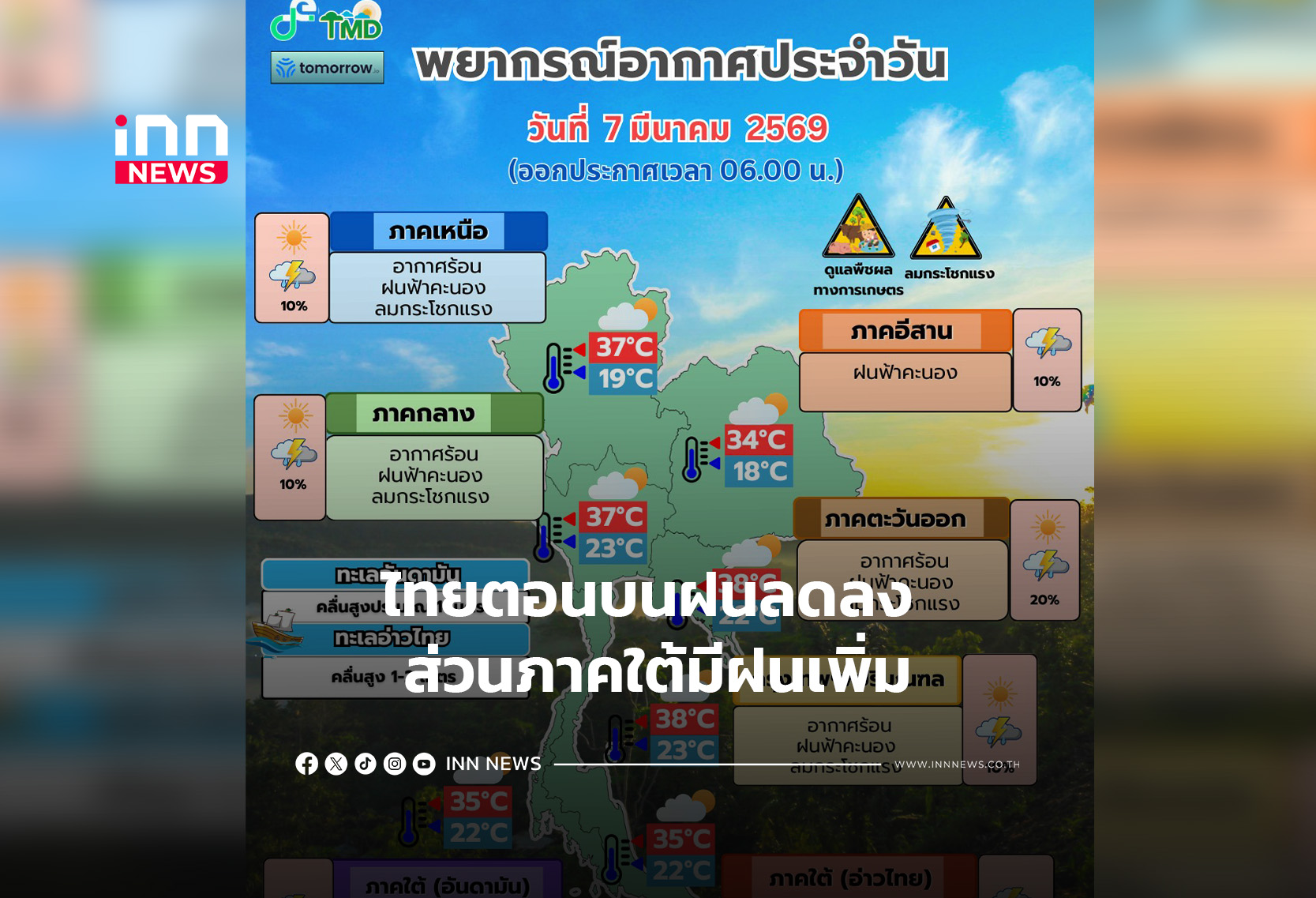 ประเทศไทยตอนบนฝนลดลง ส่วนภาคใต้มีฝนเพิ่มขึ้น ทะเลคลื่นสูง 1-2 เมตร แนะชาวเรือระมัดระวัง