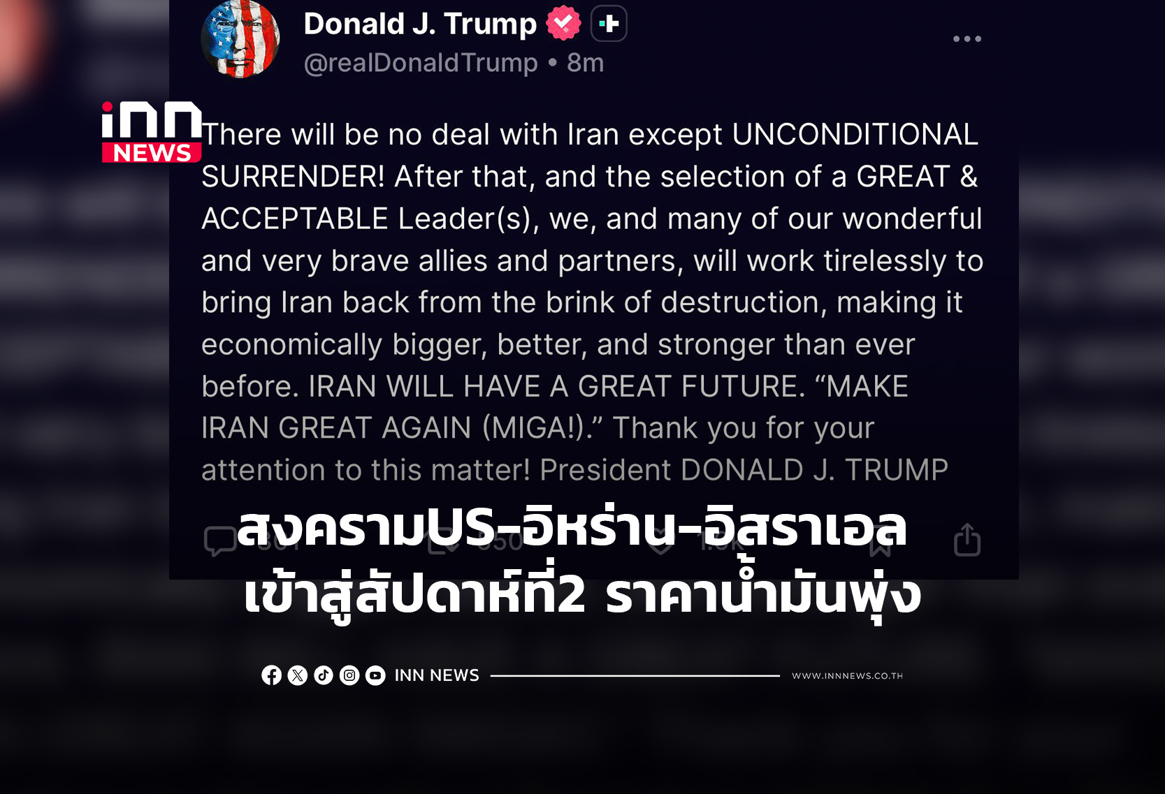 การสู้รบ สหรัฐฯ อิสราเอล และอิหร่าน เข้าสู่สัปดาห์ที่ 2 “ทรัมป์”สั่งต้องยอมแพ้แบบไม่มีเงื่อนไข ขณะ IRGC ตอบโต้อย่างหนัก ราคาน้ำมันตลาดโลกพุ่ง