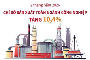 2 tháng năm 2026, chỉ số sản xuất toàn ngành công nghiệp tăng 10,4% so với cùng kỳ năm trước. Trong đó, ngành chế biến, chế tạo tăng 11,5%; ngành sản xuất và phân phối điện tăng 6,3%; ngành cung cấp nước, hoạt động quản lý và xử lý rác thải, nước thải tăng 2,1%; ngành khai khoáng tăng 5,4%.