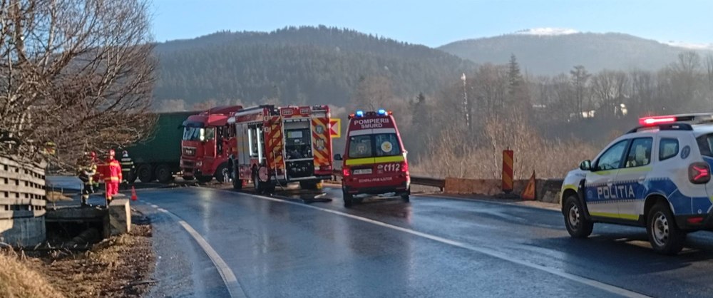 Traficul rutier este complet blocat, sâmbătă, pe DN 1, la Buşteni, după ce un TIR care a lovit un parapet a rămas pe şosea.