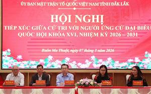 Sáng 7/3, tại phường Buôn Ma Thuột, Ban Thường trực Ủy ban Mặt trận Tổ quốc Việt Nam tỉnh Đắk Lắk tổ chức Hội nghị tiếp xúc cử tri với 5 ứng cử viên đại biểu Quốc hội khóa XVI, nhiệm kỳ 2026-2031, đơn vị bầu cử số 5.