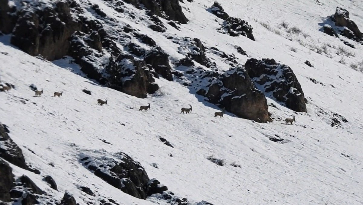 Munzur Dağları'nda etkili olan yoğun kar yağışının ardından yaban keçileri zorlu doğa koşullarında havadan görüntülendi.