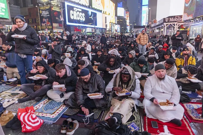 এ–বছর রমজানে নিউইয়র্কের বিখ্যাত টাইম স্কয়ার এক অভূতপূর্ব দৃশ্যের সাক্ষী হয়েছে। হাজারো মুসলিম ডিজিটাল বিলবোর্ডের আলোর নিচে দাঁড়িয়ে জামাতে তারাবি পড়েছেন।