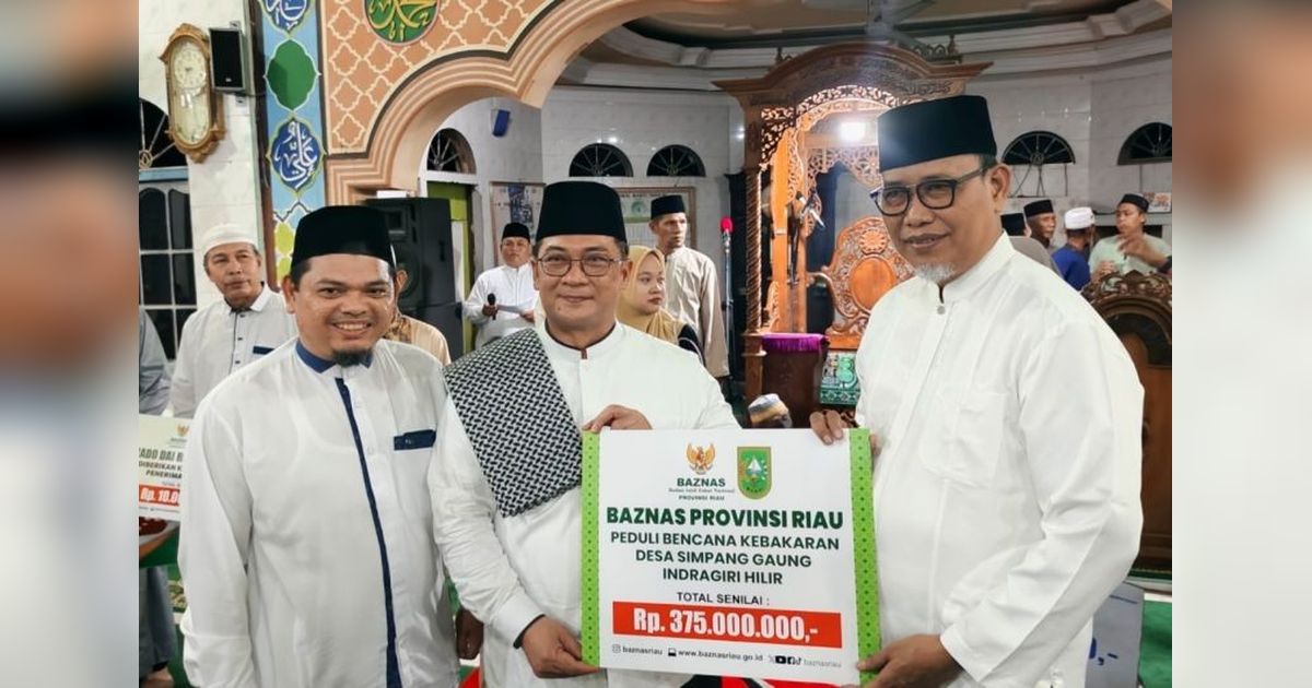 Pemerintah Provinsi Riau dan Baznas Riau menyalurkan Bantuan Kebakaran Inhil senilai Rp375 juta bagi 23 KK korban kebakaran di Desa Simpang Gaung, Indragiri Hilir, untuk meringankan beban mereka.