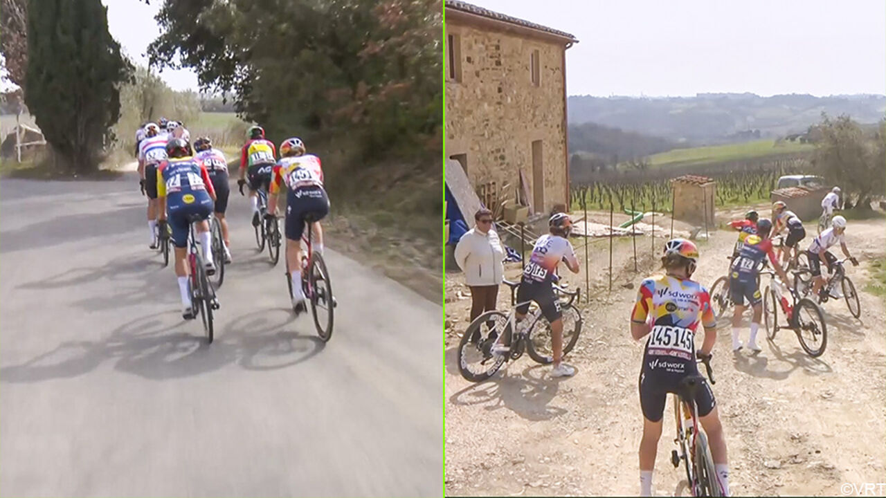 "Dat mag toch niet gebeuren!": achtervolgend elitegroepje met Kopecky en Vollering rijdt plots verkeerd in Strade #sporza
