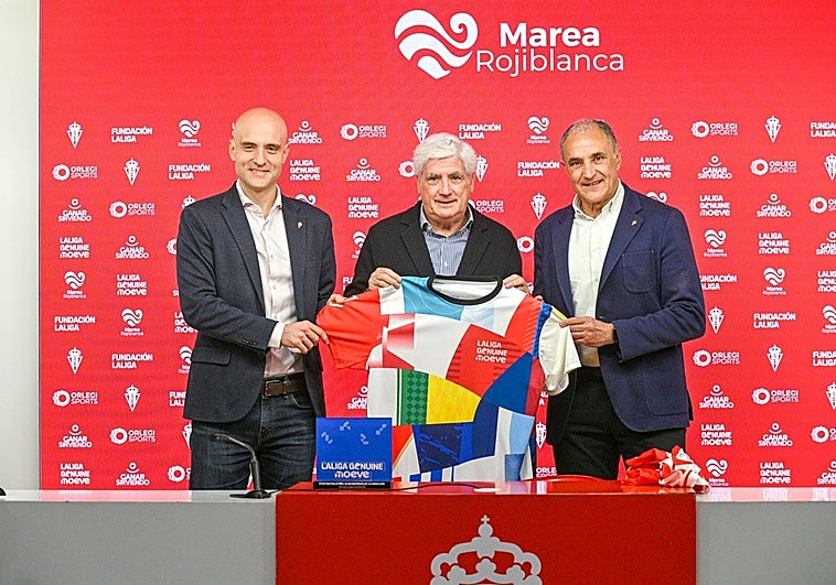 David Guerra, Joaquín y Clemente Villaverde, presidente de la Fundación de la Liga, dan el banderazo de salida en El Molinón a la segunda fase de la Liga Genuine, que se disputa este sábado y este domingo en Mareo
