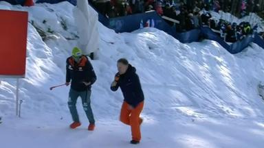 Moderator Alexander Ruda wagt das Experiment: Kommt er den Monsteranstieg beim Weltcup in Kontiolahti hoch? Lautstarke Unterstützung bekommt er von DSV-Trainer Jens Filbrich.