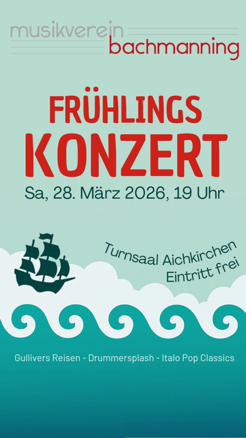 Am Samstag, den 28. März 2026, findet um 19:00 Uhr im Turnsaal der Volksschule Aichkirchen das diesjährige Frühlingskonzert statt. Den musikalischen Auftakt gestalten die Jungmusikerinnen und Jungmusiker unter der Leitung von Jugendreferentin Regina Waltenberger. Das Publikum darf sich auf ein abwechslungsreiches Programm freuen. Ein besonderes Highlight des Abends ist ein Solostück auf der Klarinette, vorgetragen von Valentina Oberndorfer. Darüber hinaus stehen unter anderem bekannte Stücke...
