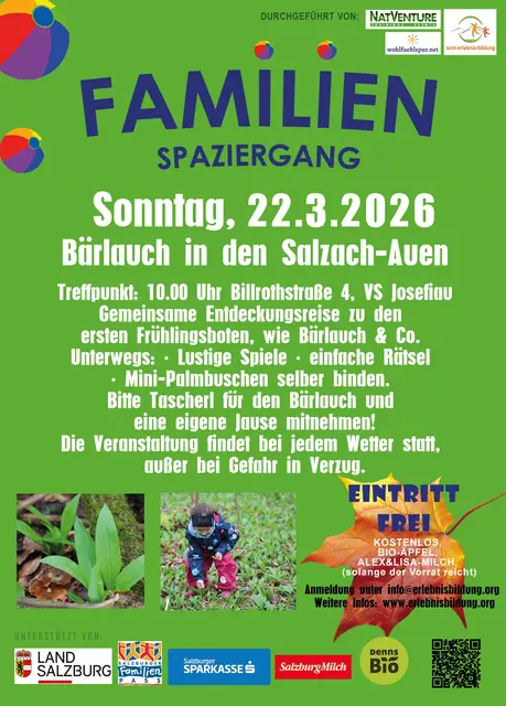 Spaziergang zum Bärlauch Sonntag 22.März 2026 Die Salzach Auen spielend erkunden und Bärlauch pflücken Der Bärlauch wächst im Frühjahr in Hülle und Fülle. Unser Team spaziert mit interessierten Familien durch die Salzach Auen. Wir schauen uns an, wie wir den Bärlauch eindeutig erkennen, sammeln ihn gemeinsam und geben euch auch ein paar leckere Rezepte mit, um den frisch geernteten Bärlauch gleich verarbeiten zu können. Bitte Sackerl oder Körbchen zum Einpacken mitnehmen! Spiele und einfache...