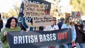 Стотици активисти се събраха в сълота в центъра на Никозия, за да протестират мирно срещу присъствието на британските бази в Акротири и Декелия на фона на продължаващата война срещу Иран, съобщи в. "Сайпръс мейл", цитиран от БТА. След като Кипър получава независимост от Обединеното кралство през 1960 г., Великобритания запазва на острова две военновъздушни бази - Акротири и Декелия, които са британски суверенни територии.