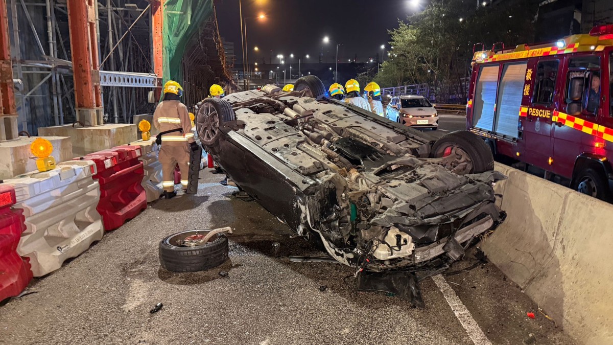 葵涌發生交通意外。今日(8日)凌晨近2時,一輛凌志私家車沿葵涌道往九龍方向行駛,途經荔景天主教中學對開時,懷疑失控先撞向左邊正在施工的水馬,隨後再衝向右邊分隔石壆,最終整輛車四輪朝天反肚。車上男司機及男乘客一度被困車內。 救援人員接報趕至,將兩人由車內救出,他們沒有受傷,事後拒絕送院。警方為男司機進行酒精測試,證明沒有超標。 就現場所見,上址葵涌道正進行道路維修,部分行車線以水馬封閉。涉事私家車嚴