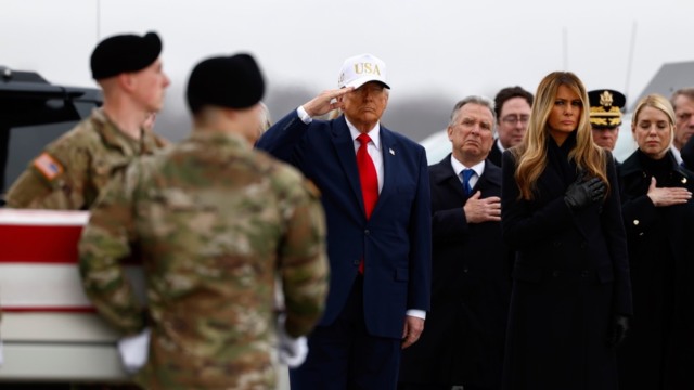 Φορώντας λευκό κασκέτο που έγραφε USA με χρυσά γράμματα, ο πρόεδρος χαιρέτισε στρατιωτικά καθώς περνούσαν τα φέρετρα καλυμμένα με την αμερικανική σημαία,