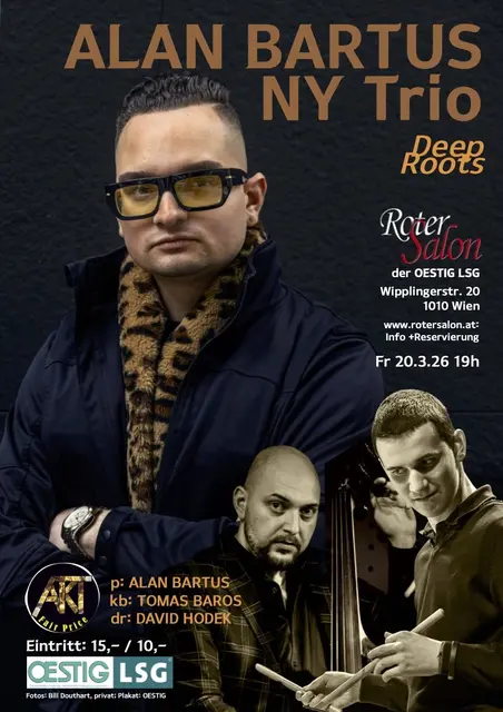 Im Jazz-Konzert Deep Roots des ALAN BARTUS New York Trio mit Kompositionen von ALAN BARTUS hat man die Chance, gleich dreimal das künstlerische Phänomen zu erleben, das einem Wunder gleichkommt: drei Musiker, die ihr Talent praktisch mit der Mutter-(bzw. mit der Vater-)Milch aufgesogen haben: Bandleader am Klavier ALAN BARTUS, Schlagzeuger DAVID HODEK und Kontrabassist TOMAS BAROS. Sie legten in jüngsten Jahren eine musikalische Selbstverständlichkeit an den Tag, für die andere ein halbes Leben...