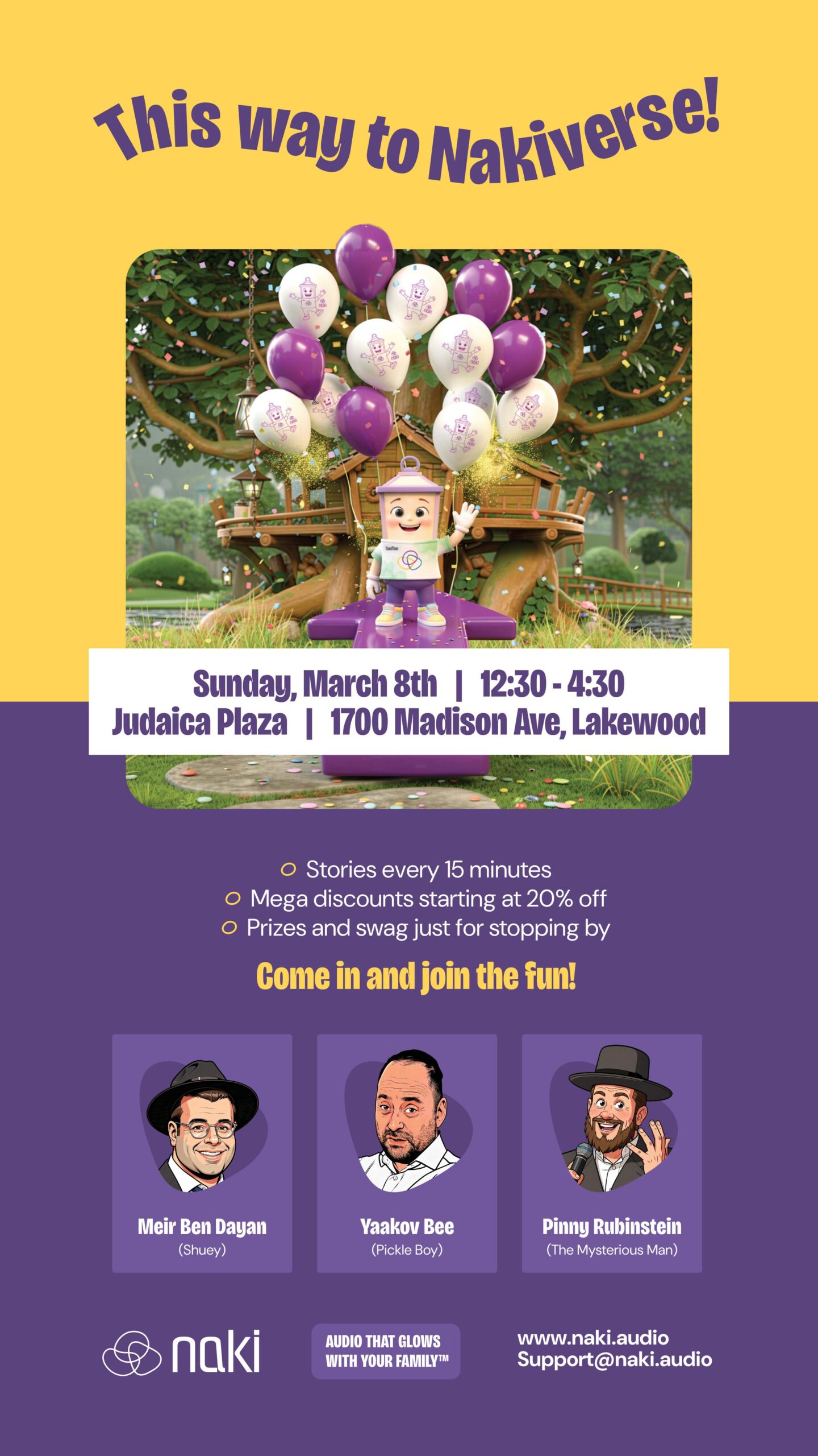 Get ready for a real-life fairytale! An exciting live listening experience is coming soon to your area: Judaica Plaza (near Gourmet Glatt), on March 8, from 12:30–4:30 p.m. Families with younger children are invited to step into the world of Naki and enjoy: Stories every 15 minutes Special appearances by storytellers Meyer Ben Dayan, […]