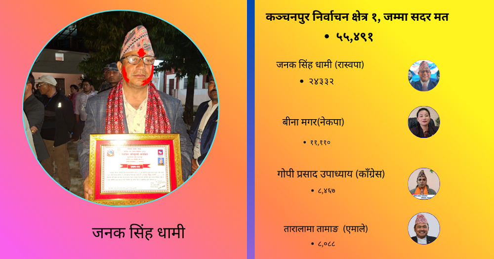 भवानीदत्त भट्टकञ्चनपुर, फागुन २४ गते । कञ्चनपुर निर्वाचन क्षेत्र–१ बाट दोब्बरभन्दा बढी मतान्तरले राष्ट्रिय स्वतन्त्र पार्टी (रास्वपा)का नेता जनक सिंह धामी विजयी हुनुभएको छ । शनिबार...