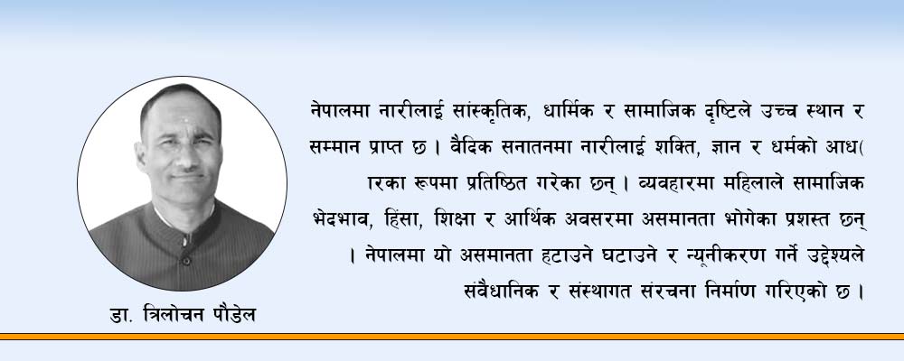 नेपालको संविधानले लैङ्गिक समानतालाई मौलिक अधिकारका रूपमा मान्यता दिएको छ । नारीविरुद्ध हिंसा, आर्थिक असमानता, राजनीतिक प्रतिनिधित्वमा न्यूनतालगायत समस्या समाधान गर्ने कानुन कार्यान...