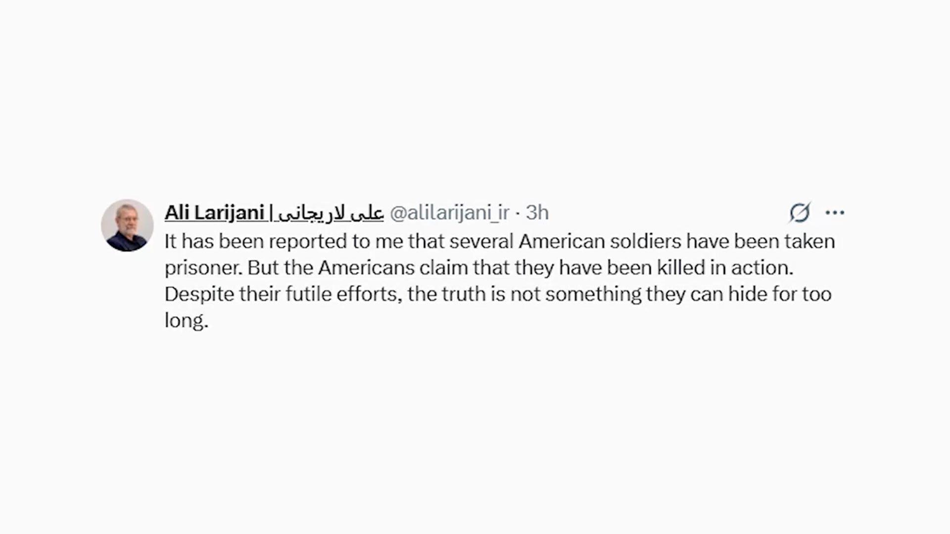 이란의 안보 수장인 알리 라리자니 최고국가안보회의 사무총장이 미군 병사를 포로로 잡았다고 주장했습니다. 라리자니는 현지시간 8일 소셜미디어 엑스에 "미군 여러 명을 포로로 잡았다는 보고를 받았다"며 "그러나 미국은 그들이 전사했다고 주장하고 있다"고 적었습니다. 다만, 포로의 수나 생포 경위 등과 관련해서 더 구체적인 언급은 없었습니다. 이에 대해 미 중부사령부 대변인은 "이란 정권은 거짓을 유포하고 속이기 위해 모든 수단을 동원하고 있으...