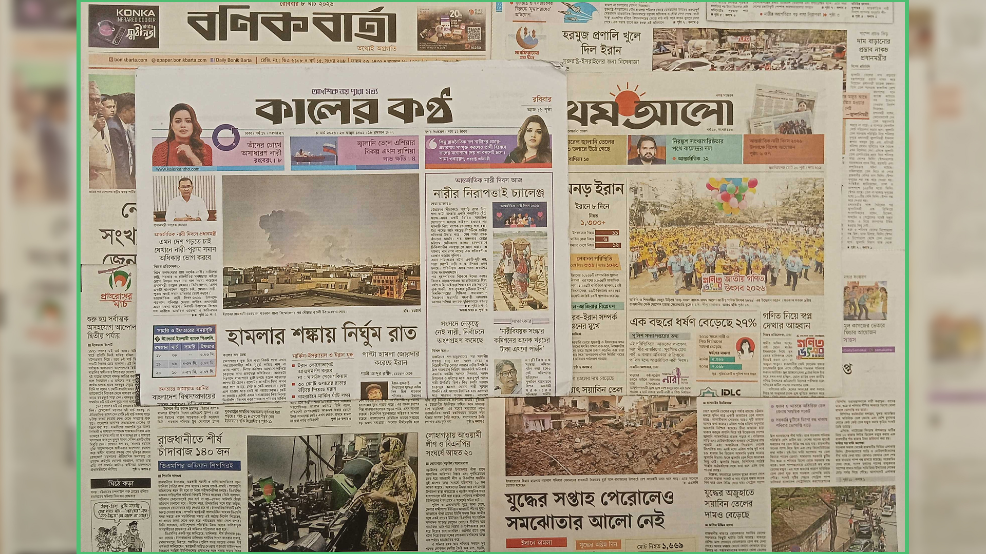 প্রতিদিন পাঠকের কাছে দেশের আলোচিত ঘটনা, রাজনৈতিক উত্তাপ, অর্থনৈতিক পরিস্থিতি, সমাজের পরিবর্তন এবং বিশ্বমঞ্চের নতুন বার্তা তুলে ধরে সংবাদপত্রগুলো। তথ্যপিপাসুদের তথ্যের চাহিদা মেটাতে সময় সংবাদ দেশের প্রধান প্রধান সংবাদপত্রের গুরুত্বপূর্ণ শিরোনাম পাঠকের সামনে তুলে ধরছে। এক নজরে জেনে নিন দেশের প্রধান সংবাদপত্রগুলোর প্রতিবেদন।দেশের শীর্ষস্থানীয় জাতীয় পত্রিকায় রোববার (৮ মার্চ) প্রকাশিত কিছু খবর নিচে তুলে ধরা হলো। এক বছরে ধর্ষণ বেড়েছে ২৭ শতাংশ - দৈনিক প্রথম আলোর প্রথম পাতার শিরোনাম এটি। প্রতিবেদনে বলা হয়েছে, মানুষের কষ্ট-দুর্ভোগ বুঝতে চাইলে আদালত আর হাসপাতালে আসুন-কথাটা মুখে মুখে বেশ চালু। তবে এটা চরম সত্যও। ১ মার্চ ঢাকার চারটি নারী ও শিশু নির্যাতন দমন ট্রাইব্যুনাল ঘোরার সময় অচেনা মুখগুলোতে বিষাদ ও উৎকণ্ঠার ছাপগুলো খুব স্পষ্টই অনুভব করা যাচ্ছিল। কক্ষের ভেতরে স্থান সংকুলান হয় না, তাই বাইরে বারান্দায় পেতে রাখা বেঞ্চে বসে ছিলেন ভুক্তভোগী নারী ও তাঁদের স্বজনেরা। মামলার নম্বর আর নাম ধরে ডাক পড়তেই নারীরা উৎকণ্ঠা নিয়ে বিচারকের সামনে দাঁড়াচ্ছিলেন। একটি ট্রাইব্যুনালে মাইক্রোফোন ব্যবহারের কারণে ভুক্তভোগী নারীদের নির্যাতনের শিকার হওয়ার বর্ণনা শোনা যাচ্ছিল স্পষ্ট। রাজধানীতে শীর্ষ চাঁদাবাজ ১৪০ জন - দৈনিক ইত্তেফাকের প্রথম পাতায় প্রকাশিত সংবাদ এটি। প্রতিবেদনে বলা হয়েছে, রাজধানীতে চাঁদাবাজ, অস্ত্রধারী সন্ত্রাসী ও দাগী আসামিদের নতুন তালিকা তৈরির কাজ শেষ হয়েছে। চলছে যাচাই-বাছাই। পাশাপাশি অভিযানের ধরন কী হবে তা নিয়ে পরীক্ষা নিরীক্ষা চলছে। ডিএমপির একজন দায়িত্বশীল কর্মকর্তা বিষয়টি নিশ্চিত করেছেন। তিনি বলেছেন, অভিযান কোনোভাবেই যেন ব্যর্থ না হয়-সে জন্য আটঘাট বেঁধেই অভিযান চালানো হবে। বিশেষ করে চাঁদাবাজির সঙ্গে যারা জড়িত, তাদেরকে কোনোভাবে ছাড় দেয়া হবে না। চাঁদাবাজির বিষয়টি বেশি গুরুত্ব দেয়া হচ্ছে। সম্প্রতি স্বরাষ্ট্রমন্ত্রী সালাহউদ্দিন আহমদ ডিএমপি সদর দফতরে এক মতবিনিময় সভায় এই কঠোর নির্দেশ দিয়েছেন, যা প্রথমে ঢাকা থেকে শুরু হয়ে পর্যায়ক্রমে সারা দেশে চলবে। তিনি বলেছেন, আইনশৃঙ্খলা পরিস্থিতি উন্নত করতে তালিকাভুক্ত অপরাধীদের গ্রেফতারে এই অভিযান পরিচালনা করা হবে।নারীর নিরাপত্তাই চ্যালেঞ্জ - দৈনিক কালের কণ্ঠের প্রথম পাতার খবর এটি। প্রতিবেদনে বলা হয়েছে, সারা দেশে আজ ৮ মার্চ রবিবার উদযাপিত হচ্ছে আন্তর্জাতিক নারী দিবস। দিবসটির এবারের প্রতিপাদ্য বিষয় ‘আজকের পদক্ষেপ, আগামীর ন্যায়বিচার, সুরক্ষিত হোক নারী ও কন্যার অধিকার’। পুলিশ সদর দফতরের তথ্য অনুযায়ী, গত পাঁচ বছরে নারী ও শিশু নির্যাতন এবং ধর্ষণসংক্রান্ত 