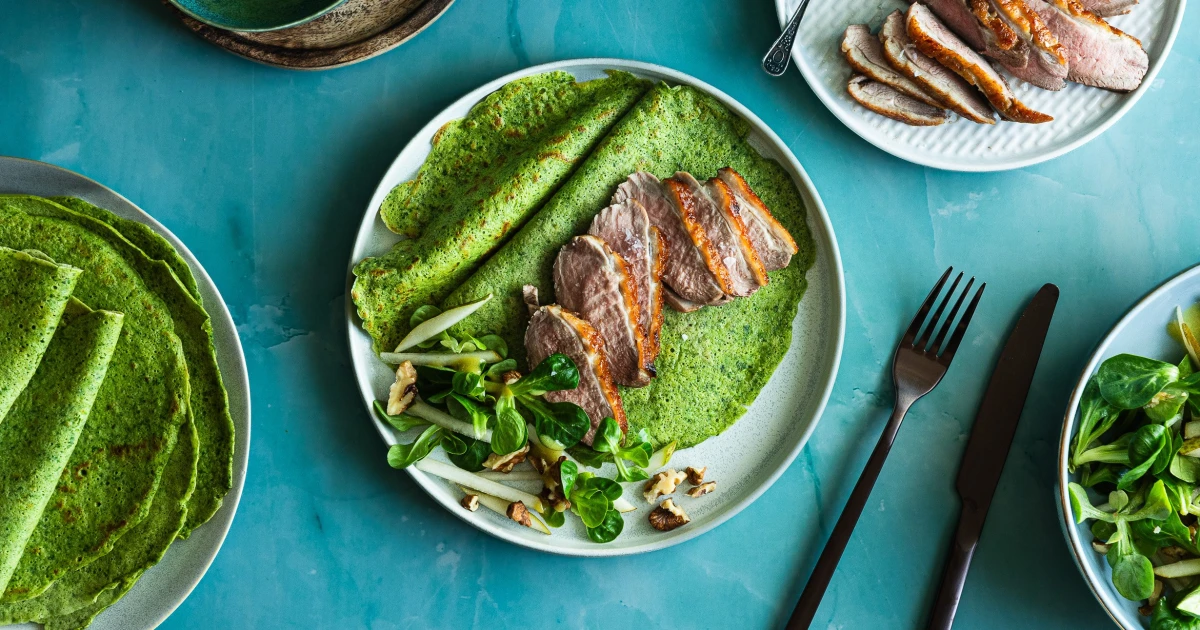 Slané palačinky s kadeřávkem zaujmou barvou i chutí. Ladí s kachnou i lehkým salátem. The post Překvapivá kombinace, která funguje. Zelené palačinky s kachnou a svěžím salátem appeared first on Forbes .