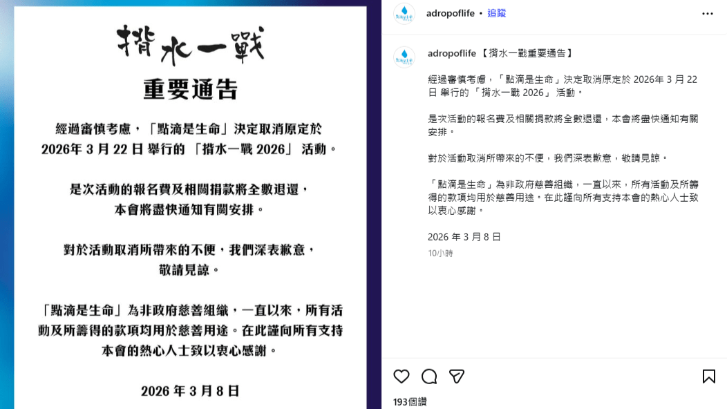 「揹水一戰」︱慈善組織「點滴是生命」(A Drop of Life)今日(8日)凌晨在官方社交平台宣布,指經過審慎考慮後,決定取消原定在於3月22日舉行的 「揹水一戰 2026」,惟未有交代原因,僅表示將會退還全數報名費及相關捐款,會盡快通知所有安排。「對於活動取消所帶來的不便,深表歉意,敬請見諒。」 「揹水一戰」取消︱參加者:昨日才剛收到選手包 據主辦單位介紹,「揹水一戰」自2013年起舉辦,今