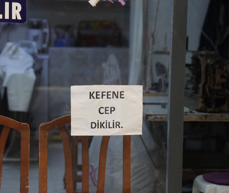 Antakya ilçesinde terzilik yapan 30 yıllık esnaf Niyazi Altınöz, kendisiyle pazarlık yapan cimri müşterilerine sözlü olarak sık sık anlattığı kefenin cebi olmadığı sözünü, 'Kefene cep dikilir' yazarak iş yerinin camına astı. İlk kez görenleri şaşırtan yazı ilgi odağı olurken Altınöz, cimrilere inat yazıyı kaldırmayacağını söyledi.