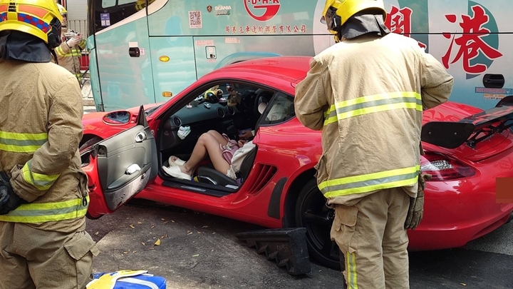 上水發生交通意外。今日(8日)下午2時06分,一輛保時捷跑車沿上水龍琛路往天平邨方向行駛,當駛至龍琛路30號近龍豐花園對開時,與一輛掛有兩地牌的旅遊巴相撞。救援人員接報到場救援,保時捷女乘客報稱頸痛受傷,由救護車送往北區醫院治理。意外原因有待警方調查。