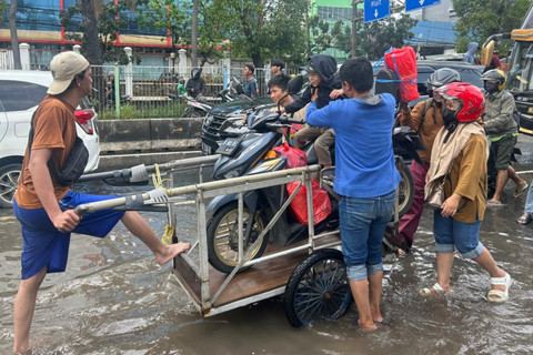 Cari Cuan di Tengah Banjir di Daan Mogot: Ojek Gerobak Jadi Pilihan