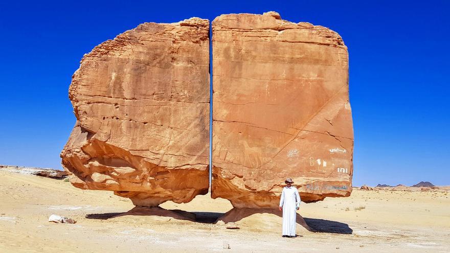 Existen formaciones geológicas que, pese a haber sido creadas por la naturaleza, parecen el resultado de algún tipo de obra artificial. En pleno desierto de Arabia Saudí, unos 50 kilómetros al sur del oasis de Tayman, se alza una de las estructuras más sorprendentes de la naturaleza en esa parte del mundo. Se trata de una formación geológica consistente en una gigantesca roca, de superficie totalmente plana y nueve metros de anchura por seis de altura, sostenida sobre un doble pedestal. Lo más curioso de todo, sin embargo, es que esta enorme losa se halla partida en dos mediante un corte totalmente recto.