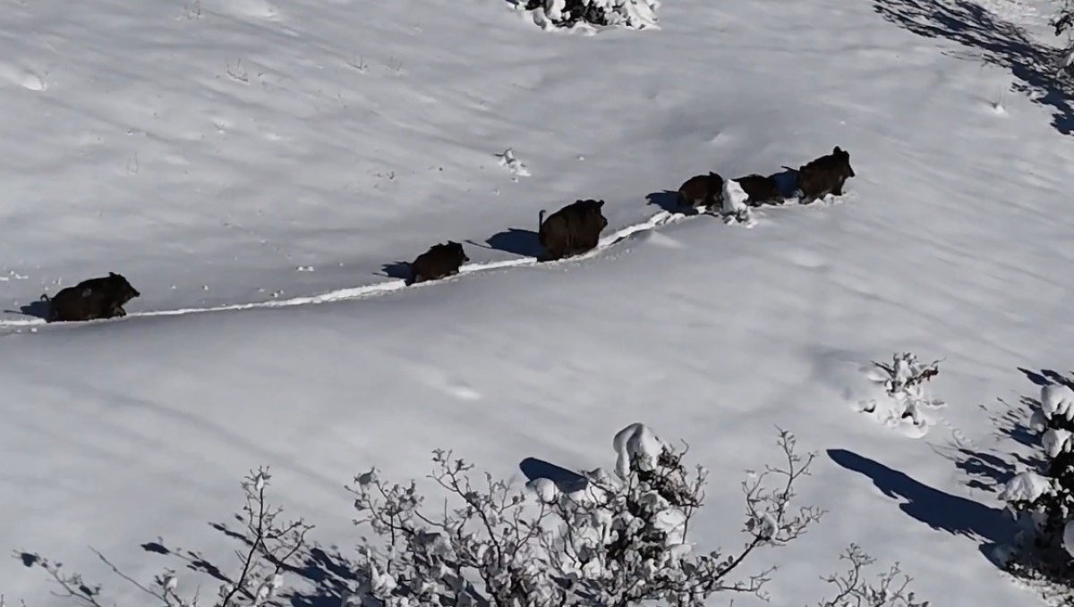 Erzincan'da karlı arazide ilerleyen yaban domuzu sürüsü, havadan görüntülendi. Ortaya çıkan görüntüler, kış şartlarında yaban hayatının verdiği yaşam mücadelesini gözler önüne serdi.